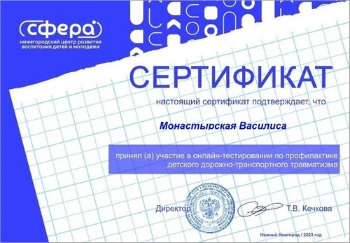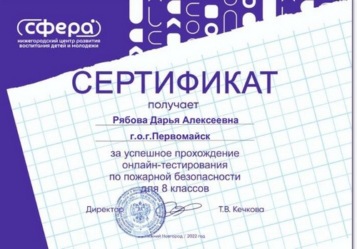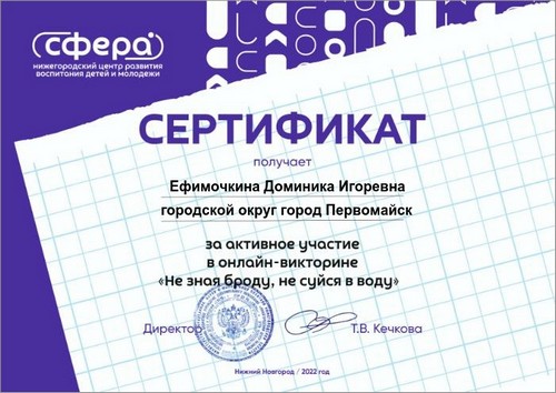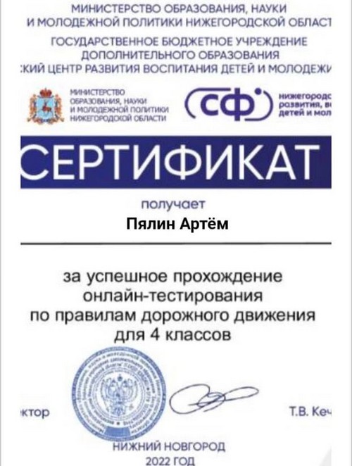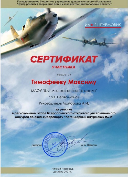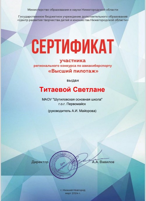 Титаева Светлана, обучающаяся 8 класса, воспитанница творческого объединения "Робототехника", под руководством учителя физики Майоровой А.И. приняла участие в региональном конкурсе по авиакиберспорту "Высший пилотаж" и по итогам данного конкурса была награждена сертификатом участника.