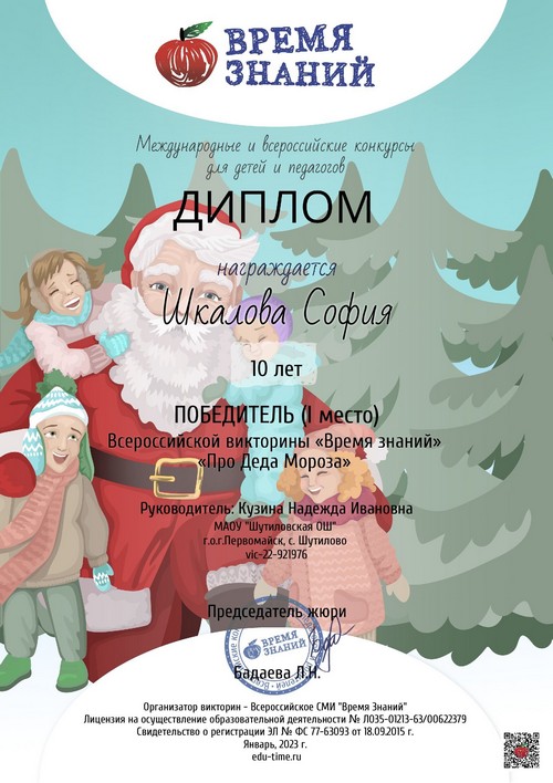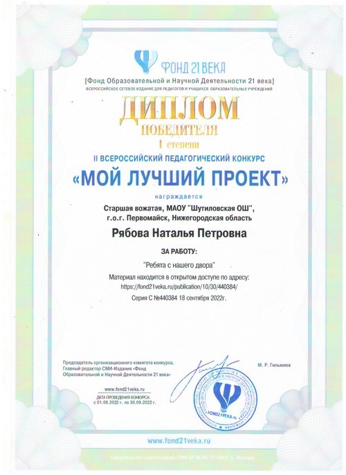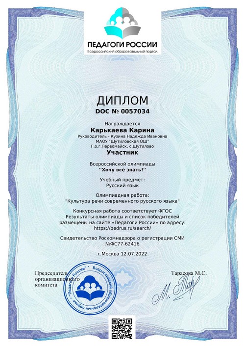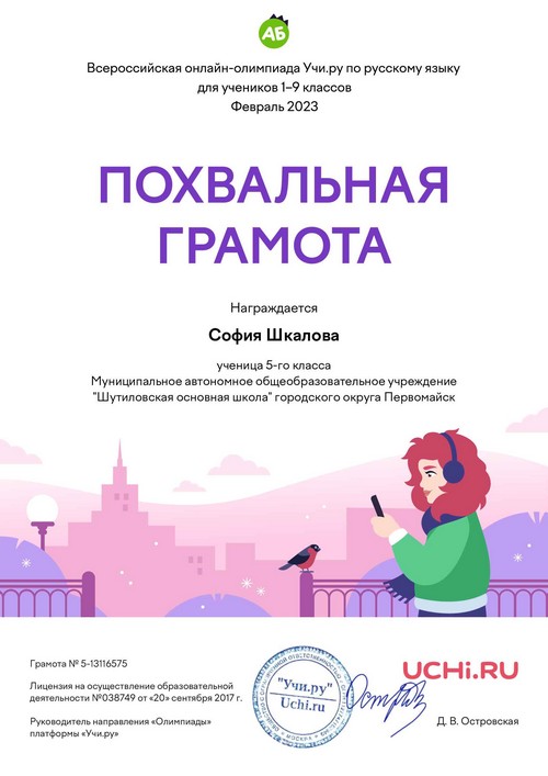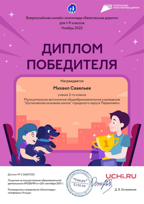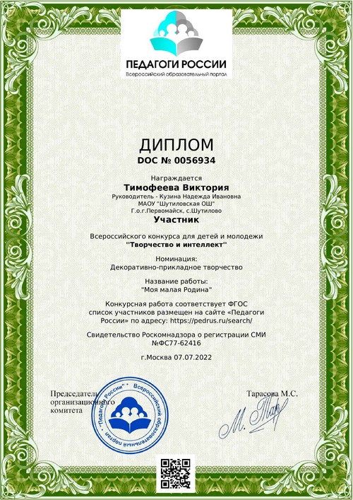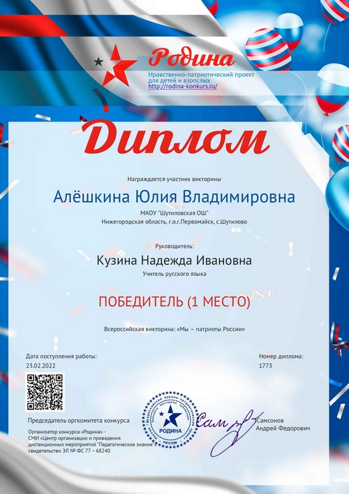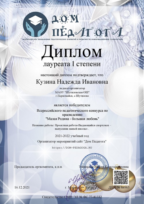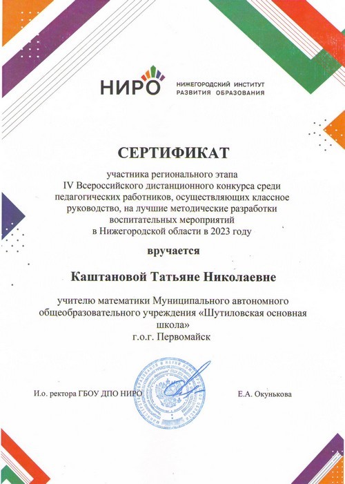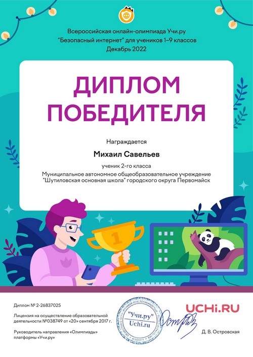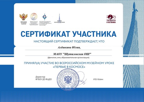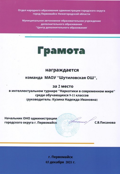 22 ноября 2021 года, в рамках реализации программ внеурочной деятельности с применением дистанционных образовательных технологий, Кузина Надежда Ивановна, педагог МАОУ «Шутиловская ОШ», приняла активное участие во всероссийской олимпиаде по теме «Современный урок: эффективная организация образовательного процесса».
