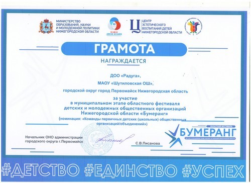 Активисты детского общественного объединения «Радуга» Шутиловской основной школы приняли активное участие в муниципальном этапе областного фестиваля детских и молодёжных организаций Нижегородской области «Бумеранг» (руководитель: Каштанова Т.Н.).
