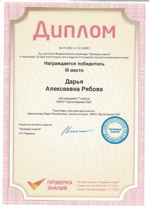 12 декабря семейный коллектив Рябовых: Дарья, Татьяна и Екатерина, воспитанница дошкольной группы и обучающиеся 4, 7 классов МАОУ «Шутиловская ОШ», приняли активное участие во Всероссийской олимпиаде, посвящённой Дню Конституции РФ.