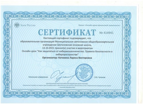 14 октября, в рамках реализации дополнительной общеобразовательной общеразвивающей программы социально-гуманитарной направленности «Финансовая грамотность для младших школьников», Катихина Лариса Викторовна приняла участие в онлайн-уроке «Как защититься от кибермошенничества. Правила безопасности в киберпространстве».