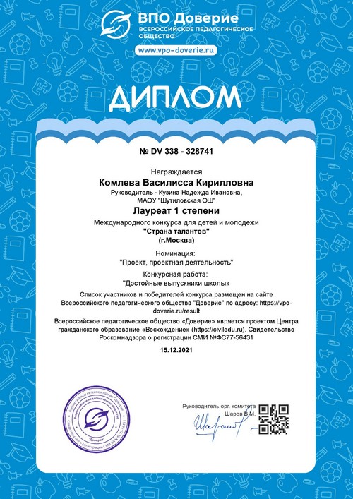 15 декабря, в рамках реализации проектной деятельности в условиях реализации ФГОС в сельской малокомплектной школе, обучающаяся 9 класса Комлева Василисса приняла участие в международном конкурсе по краеведению «Страна талантов» в номинации «Проект, проектная деятельность» по теме «Достойные выпускники школы» (руководитель: Кузина Н.И.).