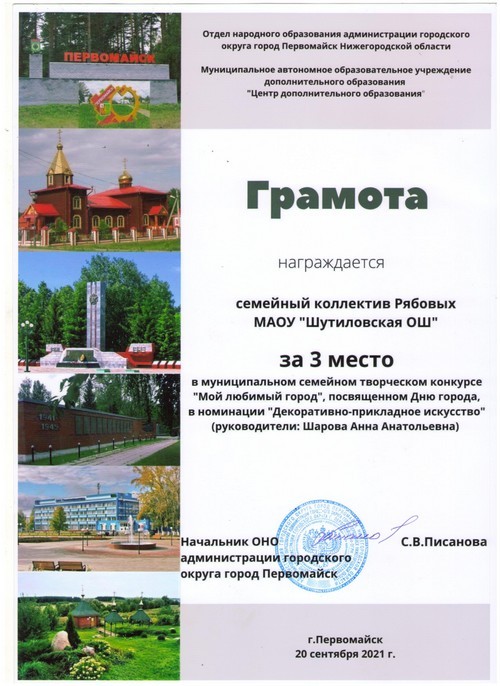 Семейный коллектив Рябовых дошкольной группы МАОУ «Шутиловская ОШ» принял участие в муниципальном семейном творческом конкурсе «Мой любимый город», посвящённом Дню города Первомайск (руководитель: Шарова А.А.).