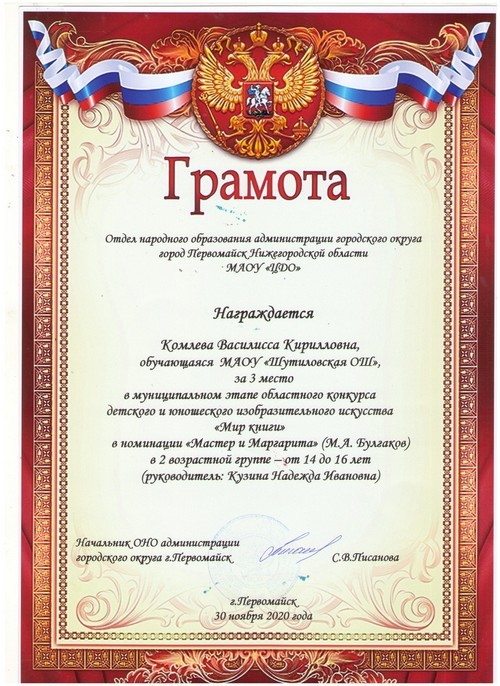 Подведены итоги муниципального конкурса «Мир книги», в котором принимала участие Комлева Василисса, воспитанница творческого объединения «Волшебная кисть», активистка ДОО «Радуга», обучающаяся 8 класса Шутиловской основной школы (руководитель: Кузина Н.И.).
