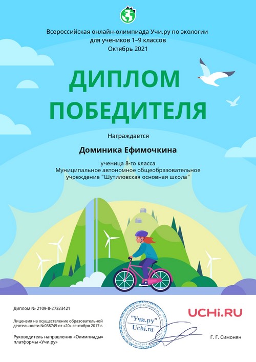 26 октября, в рамках реализации программ внеурочной деятельности с применением дистанционных образовательных технологий и занятости школьников в период осенних каникул, Ефимочкина Доминика, обучающаяся 8 класса Шутиловской основной школы приняла активное участие в онлайн-олимпиаде Учи.ру по экологии (руководитель: Крылова М.Н.).