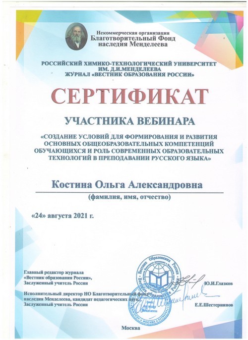 24 августа 2021 года педагоги Шутиловской основной школы: Костина Ольга Александровна, Кузина Надежда Ивановна и Шилова Татьяна Викторовна приняли активное участие в онлайн - вебинаре по теме «Создание условий для формирования и развития основных общеобразовательных компетенций обучающихся и роль современных образовательных технологий в преподавании русского языка».