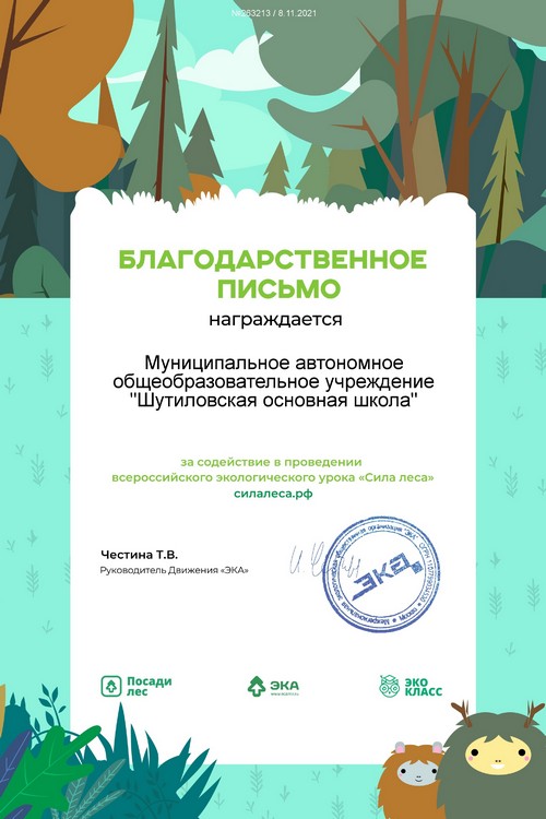 С 14 по 21 ноября на портале, в рамках реализации федерального проекта «Успех каждого ребенка» национального проекта «Образование», обучающиеся 6 класса и педагоги МАОУ «Шутиловская ОШ», приняли активное участие во Всероссийском экологическом диктанте- 2021.