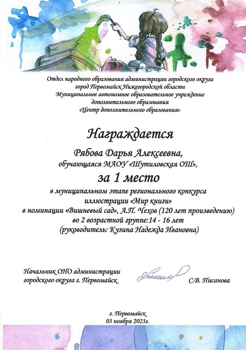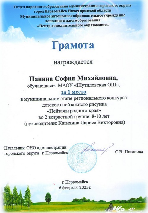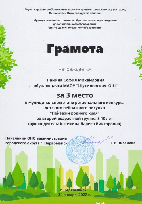 Подведены итоги муниципального этапа регионального конкурса детского пейзажного рисунка «Пейзажи родного края», в котором приняла активное участие Рябова Дарья, обучающаяся 6 класса Шутиловской основной школы (руководитель: Кузина Н.И.).