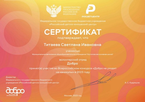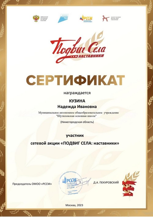 Педагоги МАОУ «Шутиловская ОШ» Каштанова Т.Н. и Кузина Н.И., реализующие основные направления деятельности Российского движения школьников, прошли обучение на онлайн-платформе «Корпоративный университет РДШ». Получены сертификаты.