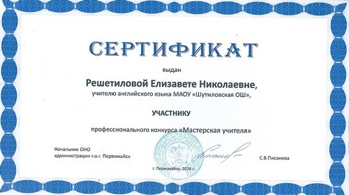 23 апреля на базе Первомайской средней школы был проведён муниципальный конкурс профессионального мастерства для педагогов начального общего образования «Мастерская учителя-2024», в котором приняла участие учитель английского языка Решетилова Е.Н.