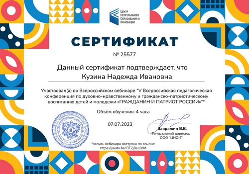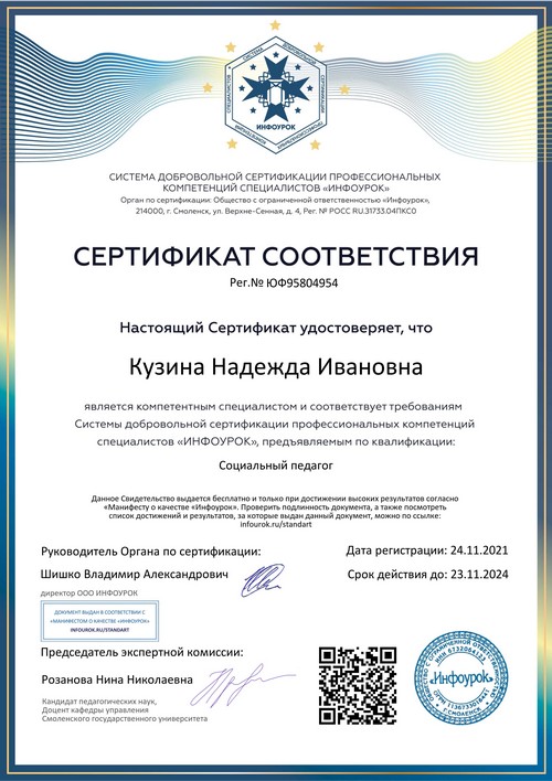 В период с 27 сентября по 24 ноября 2021 года, в рамках реализации программ внеурочной деятельности с применением дистанционных образовательных технологий по профилактической работе с несовершеннолетними, Кузина Надежда Ивановна, МАОУ «Шутиловская ОШ», в целях получения профессиональных компетенций специалистов, предъявляемым по квалификации: «Социальный педагог» прошла обучение.