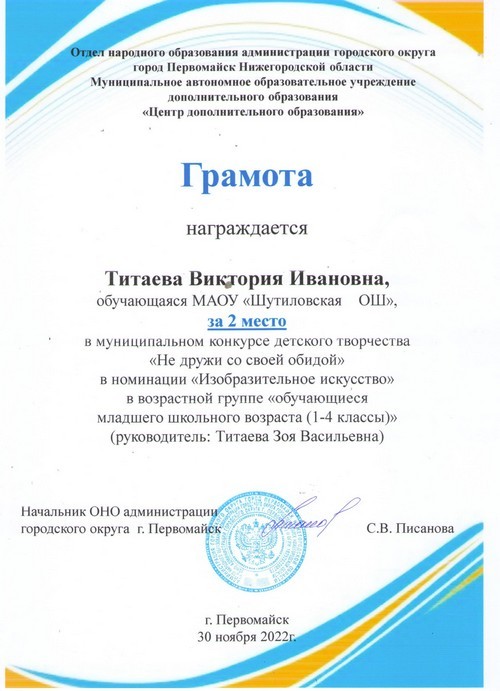 Подведены итоги Международного конкурса детского творчества «Красота Божьего мира», в котором приняли активное участие обучающиеся Шутиловской основной школы: Карькаева Карина, Комлева Василисса и Кульнева Анастасия (руководитель: Кузина Н.И.).