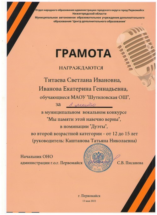 13 мая 2021 года состоялся муниципальный вокальный конкурс «Мы памяти этой навечно верны», в котором приняли активное участие Иванова Екатерина и Титаева Светлана, обучающиеся 5 класса Шутиловской основной школы (руководитель: Каштанова Т.Н.).