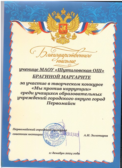Обучающиеся 3-7 классов МАОУ «Шутиловская ОШ» приняли активное участие в творческом конкурсе «Мы против коррупции» среди учащихся образовательных учреждений городского округа город Первомайск, который проводился Первомайской городской прокуратурой Нижегородской области.