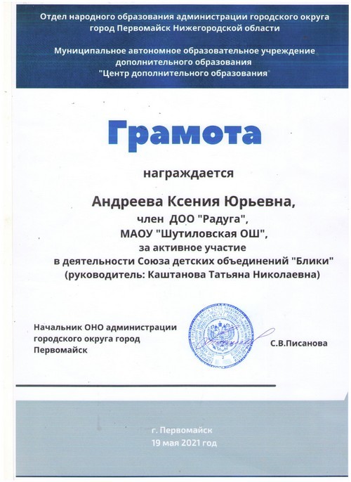 Подведены итоги муниципального этапа Всероссийского конкурса лидеров и руководителей детских и молодежных общественных объединений «Лидер XXI века», в котором принимала участие Андреева Ксения, председатель детского общественного объединения «Радуга» Шутиловской основной школы (руководитель: Каштанова Т.Н.).