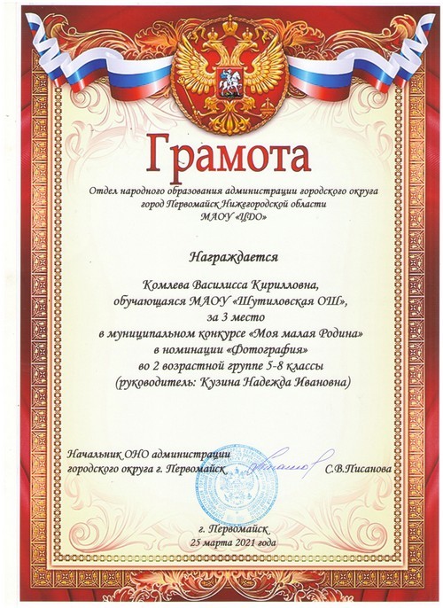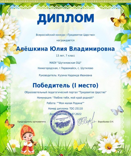 Подведены итоги муниципального конкурса «Моя малая Родина», в котором принимала участие Комлева Василисса, воспитанница творческого объединения «Волшебная кисть», активистка ДОО «Радуга», обучающаяся 8 класса Шутиловской основной школы (руководитель: Кузина Н.И.).