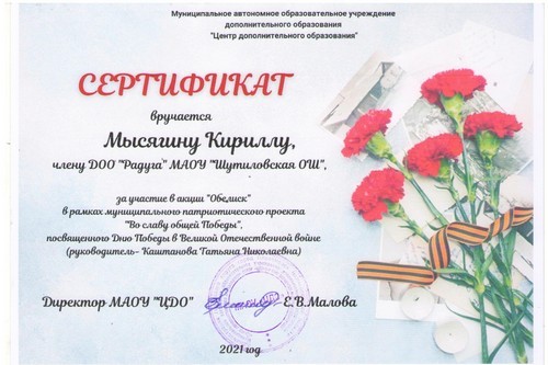 В рамках акции, приуроченной ко Дню Великой Победы, на сайте диктантпобеды.рф обучающиеся 5 класса, воспитанники творческого объединения «Волшебная кисть» МАОУ «Шутиловская ОШ» приняли активное участие во Всероссийском историческом диктанте, посвящённом основным событиям Великой Отечественной войны (руководитель: Кузина Н.И.).