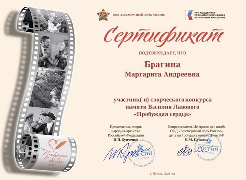 Брагина Маргарита и Даньшина Татьяна, обучающиеся 2 класса под руководством классного руководителя Катихиной Ларисы Викторовны и родительской общественности Брагиной Е.Г. приняли участие в творческом конкурсе «Пробуждая сердца», проводимом в память о Сопредседателе гражданско-патриотического движения «Бессмертный полк России» Василии Семёновиче Лановом, Народном артисте СССР, Герое Труда РФ.