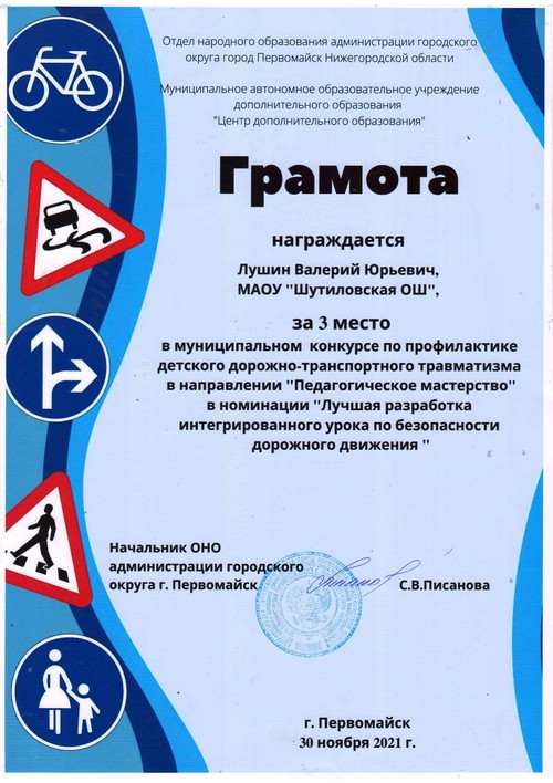 Лушин Валерий Юрьевич, учитель основы безопасности жизнедеятельности Шутиловской основной школы принял участие в муниципальном конкурсе по профилактике детского дорожно-транспортного травматизма в направлении «Педагогическое мастерство», в номинации «Лучшая разработка интегрированного урока по безопасности дорожного движения».