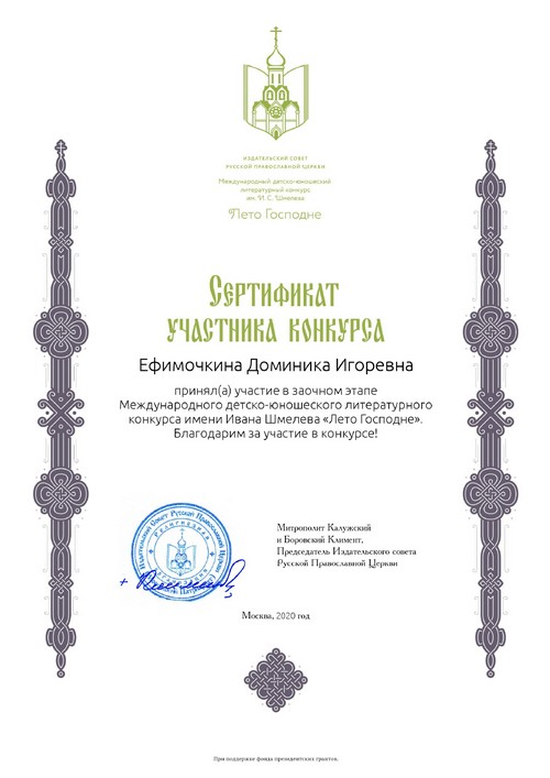 В рамках реализации программ внеурочной деятельности с применением дистанционных образовательных технологий Ефимочкина Доминика, обучающаяся 7 класса Шутиловской основной школы, приняла участие в заочном этапе Международного детско-юношеского литературного конкурса имени Ивана Шмелева «Лето Господне» (руководитель: Шилова Т.В.).