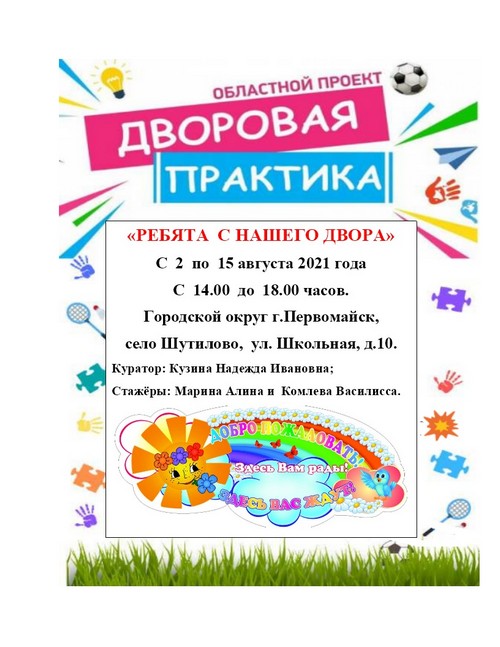 МАОУ «Шутиловская ОШ» информирует, что с 2 августа по 15 августа 2021 года в с.Шутилово, ул. Школьная, д.10 будет открыта Дворовая площадка «Ребята с нашего двора» для организованного досуга детей (старшеклассники-стажёры выступят организаторами в проекте «Дворовая практика»).