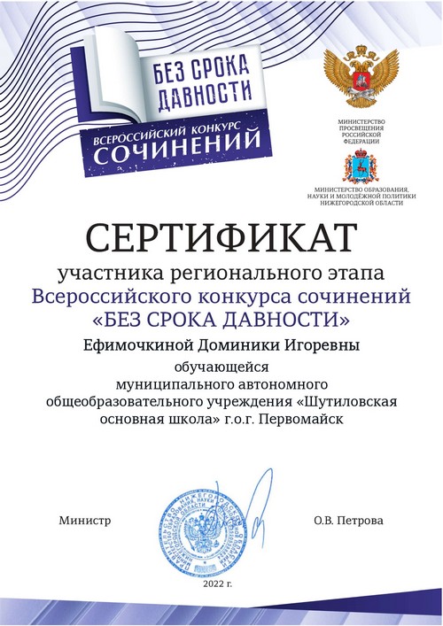 Ефимочкина Доминика, обучающаяся 8 класса МАОУ «Шутиловская ОШ», под руководством Шиловой Татьяны Викторовны, учителя русского языка и литературы, приняла активное участие в муниципальном этапе Всероссийского конкурса сочинений «Без срока давности».