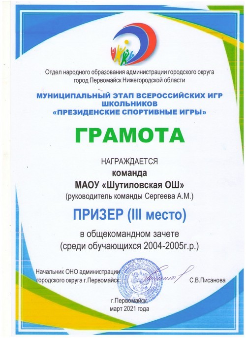 13 февраля команда Шутиловской основной школы: Алёшкина Юлия, Арешин Артём и Мысягин Кирилл, обучающиеся 6 класса, Андреева Ксения, Комлева Василисса и Максимов Максим, обучающиеся 8 класса, приняли активное участие во Всероссийской массовой лыжной гонке в городском округе город Первомайск Нижегородской области «Лыжня России-2021» (руководитель: Сергеева А.М.).