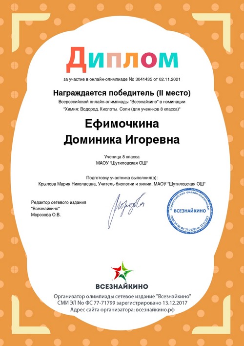 2 ноября, в рамках реализации программ внеурочной деятельности с применением дистанционных образовательных технологий и занятости школьников в период осенних каникул, Ефимочкина Доминика, обучающаяся 8 класса Шутиловской основной школы приняла активное участие в онлайн-олимпиаде «Всезнайкино» в номинации «Химия. Водород. Кислоты» (руководитель: Крылова М.Н.).