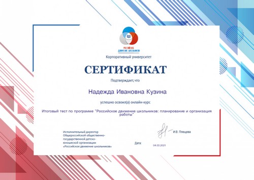 Педагоги МАОУ «Шутиловская ОШ» Каштанова Т.Н. и Кузина Н.И., реализующие основные направления деятельности Российского движения школьников, прошли обучение на онлайн-платформе «Корпоративный университет РДШ». Получены сертификаты.
