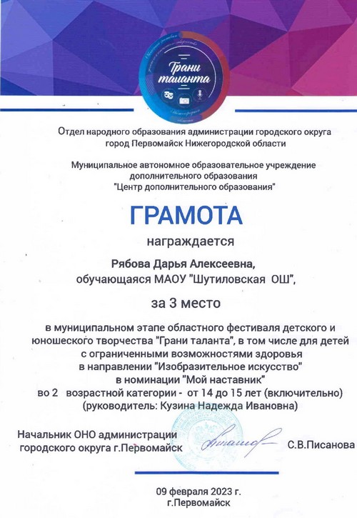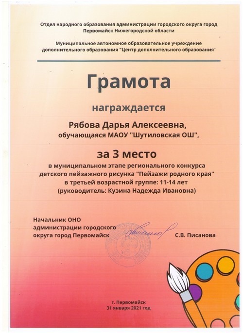 Подведены итоги муниципального этапа регионального конкурса детского пейзажного рисунка «Пейзажи родного края», в котором приняла активное участие Рябова Дарья, обучающаяся 6 класса Шутиловской основной школы (руководитель: Кузина Н.И.).