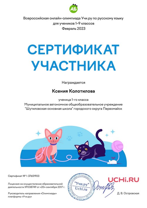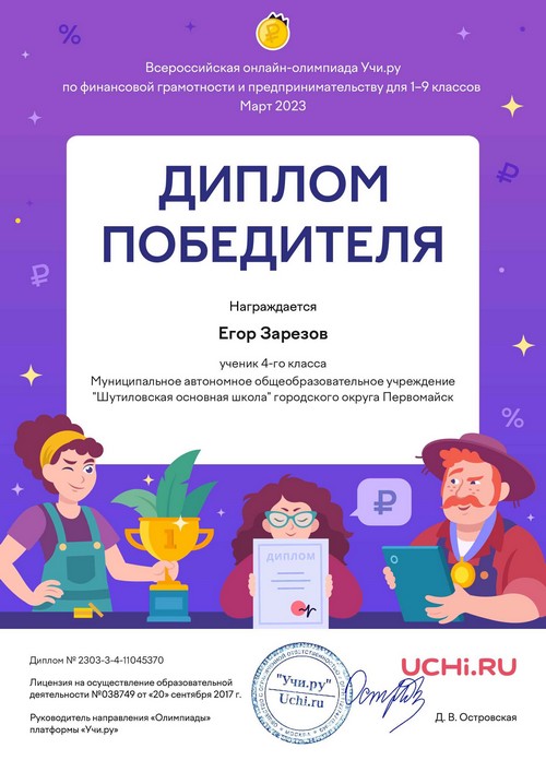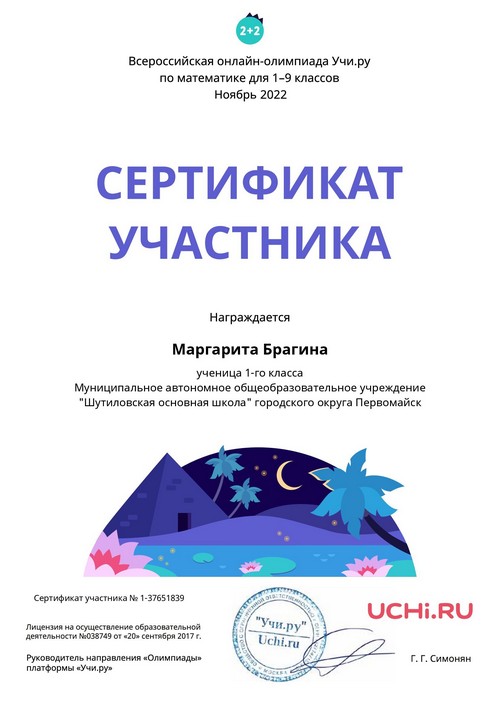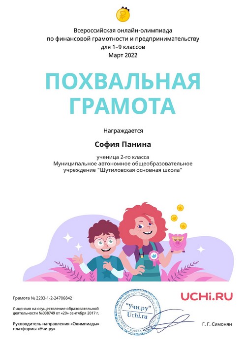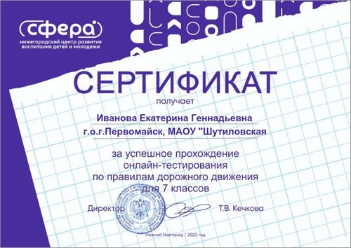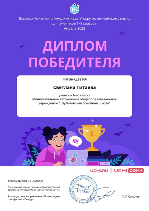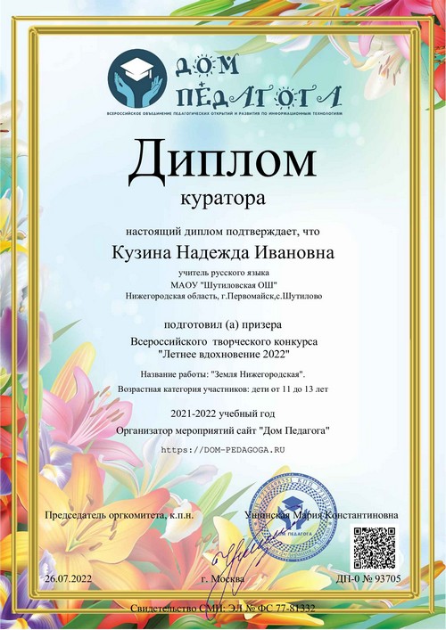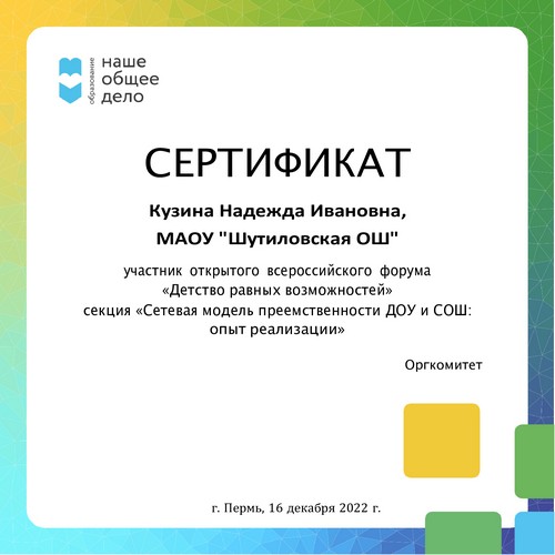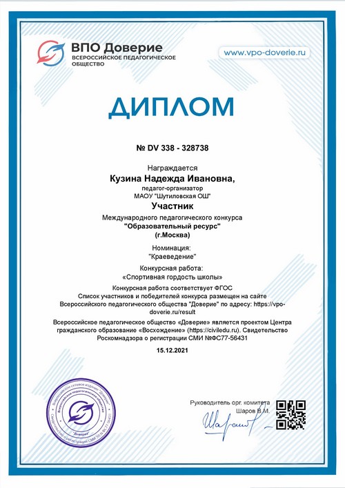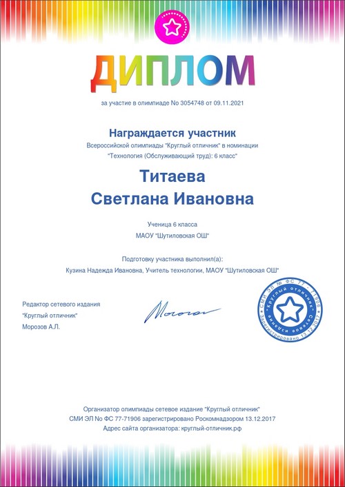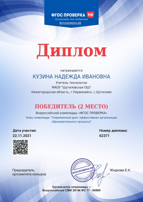 22 ноября 2021 года, в рамках реализации программ внеурочной деятельности с применением дистанционных образовательных технологий, Кузина Надежда Ивановна, педагог МАОУ «Шутиловская ОШ», приняла активное участие во всероссийской олимпиаде по теме «Современный урок: эффективная организация образовательного процесса».