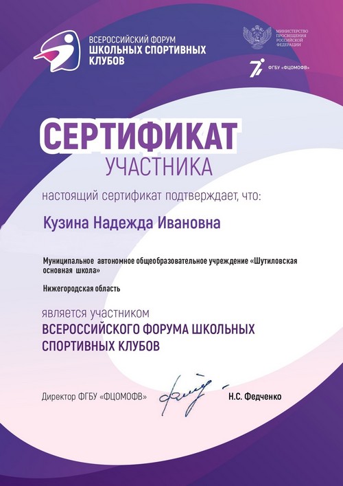 В период с 27 по 29 октября 2021 года педагоги МАОУ «Шутиловская ОШ» Сергеева Антонина Михайловна и Кузина Надежда Ивановна приняли активное участие в Форуме школьных спортивных клубов по теме «Школьный спортивный клуб – основа современной региональной модели развития школьного спорта» (в онлайн-формате).
