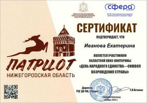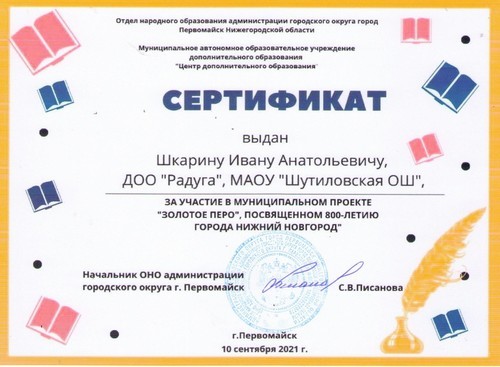 Шкарин Иван, обучающийся 8 класса, участник ДОО «Радуга» МАОУ «Шутиловская ОШ» принял участие в муниципальном проекте «Золотое перо», посвящённом 800-летию города Нижнего Новгорода (руководитель: Каштанова Т.Н.).