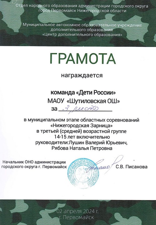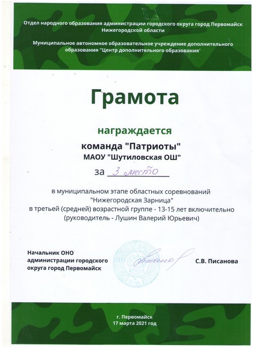 17 марта на базе МАУ «Физкультурно-оздоровительный комплекс в г. Первомайск Нижегородской области» состоялся муниципальный этап областных соревнований «Нижегородская Зарница», в котором приняла участие команда «Патриоты» Шутиловской основной школы (руководители: Лушин В.Ю. и Сергеева А.М.).