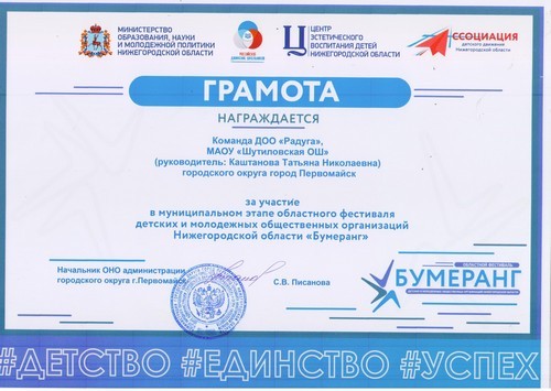 Активисты детского общественного объединения «Радуга» Шутиловской основной школы приняли активное участие в муниципальном этапе областного фестиваля детских и молодёжных организаций Нижегородской области «Бумеранг» (руководитель: Каштанова Т.Н.).