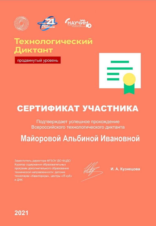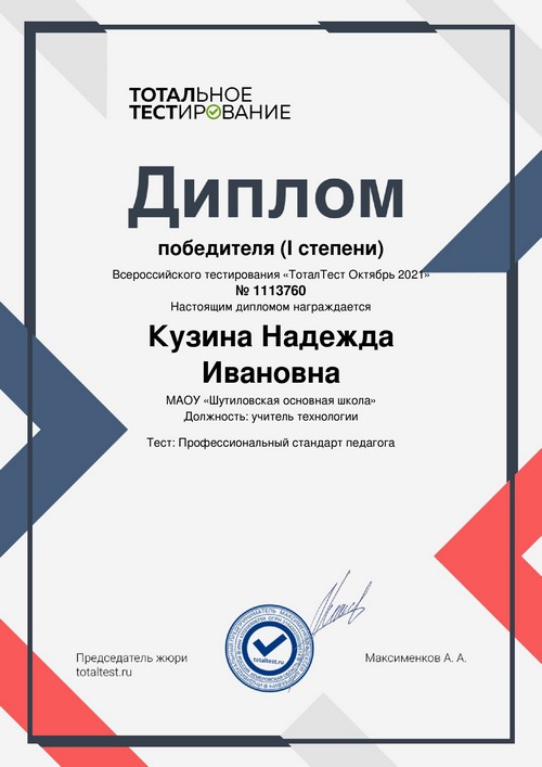 В рамках реализации программ внеурочной деятельности с применением дистанционных образовательных технологий Кузина Надежда Ивановна, учитель технологии Шутиловской основной школы, приняла участие во всероссийском тестировании «ПедЭксперт Октябрь-2021» в направлении: «Профессиональный стандарт педагога».