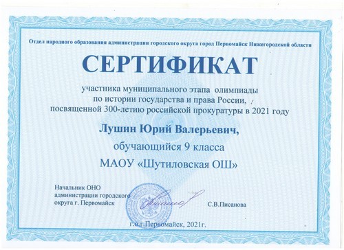 В октябре, в рамках мероприятий, приуроченных к памятным датам российской истории и культуры, обучающийся 9 класса МАОУ «Шутиловская ОШ» Лушин Юрий принял участие в муниципальном этапе олимпиады по истории государства и права России, посвящённой 300-летию российской прокуратуры в 2021 году (руководитель: Шематонова М.М.).