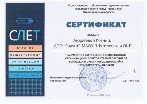 19 мая 2021 года активисты детского общественного объединения «Радуга» и Совета старшеклассников Шутиловской основной школы приняли активное участие в Слете детских общественных объединений и Советов старшеклассников (руководитель: Каштанова Т.Н., старший вожатый).