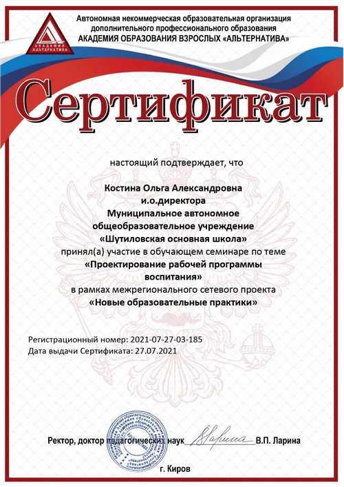 27 июля 2021 года, в рамках межрегионального проекта «Новые образовательные практики», Костина Ольга Александровна и Кузина Надежда Ивановна приняли активное участие в обучающем семинаре по теме «Проектирование рабочей программы воспитания».