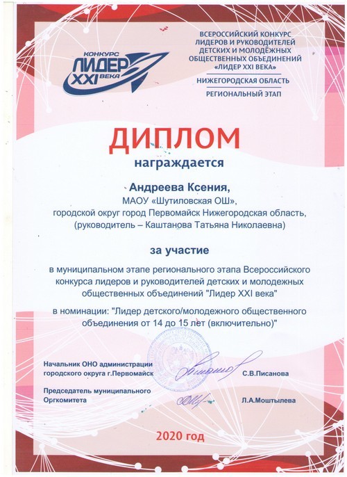 Подведены итоги муниципального этапа Всероссийского конкурса лидеров и руководителей детских и молодежных общественных объединений «Лидер XXI века», в котором принимала участие Андреева Ксения, председатель детского общественного объединения «Радуга» Шутиловской основной школы (руководитель: Каштанова Т.Н.).