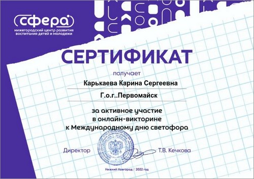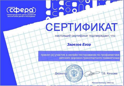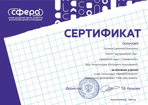 Титаева Светлана, обучающаяся 8 класса, воспитанница творческого объединения "Робототехника", под руководством учителя физики Майоровой А.И. приняла участие в региональном конкурсе по авиакиберспорту "Высший пилотаж" и по итогам данного конкурса была награждена сертификатом участника.