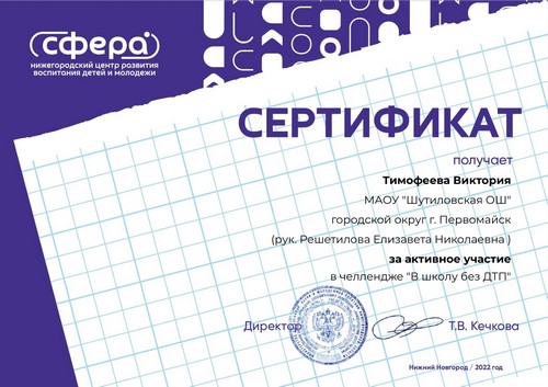 Тимофеев Максим, Титаева Светлана и Шкалофа София, обучающиеся МАОУ "Шутиловская ОШ", приняли участие в межрегиональном конкурсе видеороликов «В объективе БезОпасности» среди обучающихся Приволжского федерального округа в номинации «Соблюдая ПДД» (руководитель: Кузина Н.И.).