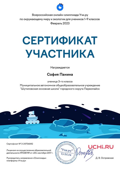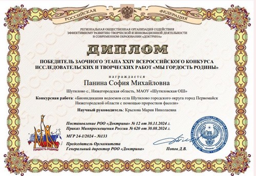 Панина София, обучающаяся 5 класса Шутиловской основной школы, воспитанница творческого объединения "Основы проектно-исследовательской деятельности", который реализуется на базе Центра естественно-научной и технологической направленностей "Точка роста", стала победителем заочного этапа XXIV Всероссийского конкурса исследовательских и творческих работ "Мы гордость Родины".