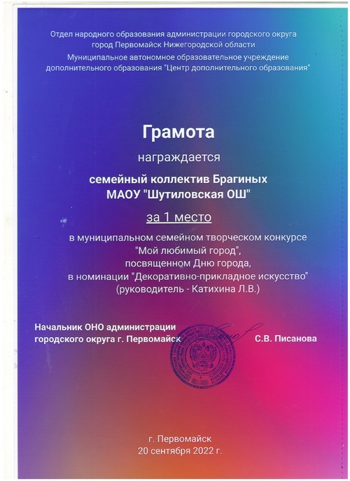 Семейный коллектив Рябовых дошкольной группы МАОУ «Шутиловская ОШ» принял участие в муниципальном семейном творческом конкурсе «Мой любимый город», посвящённом Дню города Первомайск (руководитель: Шарова А.А.).