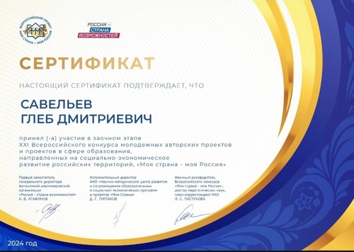 Савельев Глеб, обучающийся 9 класса Шутиловской основной школы, под руководством советника директора по воспитанию Решетиловой Е.Н. принял участие в заочном этапе XXI Всероссийского конкурса молодежных авторских проектов и проектов в сфере образования, направленных на социально-экономическое развитие российских территорий, «Моя страна – моя Россия».