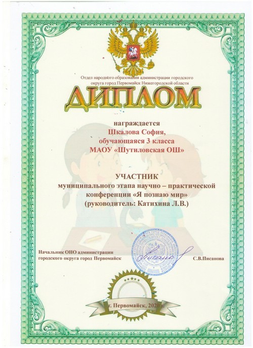 Подведены итоги муниципального этапа научно-практической конференции «Я познаю мир, в котором приняла участие Шкалова София, обучающаяся 3 класса Шутиловской основной школы (руководитель: Катихина Л.В.).
