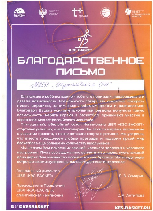23 ноября юноши 7- 9 классов МАОУ «Шутиловская ОШ» приняли участие в муниципальном этапе Всероссийского Чемпионата школьной баскетбольной лиги «КЭС-БАСКЕТ» (руководитель: Сергеева А.М.).