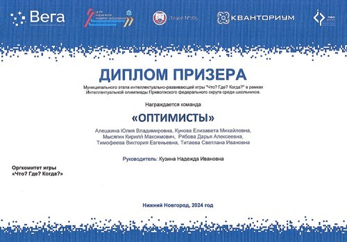 26 января 2024 года наша команда «Оптимисты» (обучающиеся 9 класса) в рамках муниципального этапа Интеллектуальной Олимпиады Приволжского федерального округа (ПФО) среди школьников приняли участие в игре «Что? Где? Когда?» (руководитель: Кузина Н.И.).