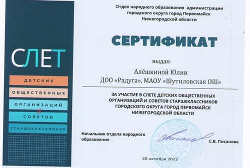Активисты детского общественного объединения «Радуга» и Совета старшеклассников Шутиловской основной школы: Андреева Ксения, Комлева Василисса, Кульнева Анастасия, Титаева Светлана, Тимофеева Виктория и Марина Алина приняли активное участие в Слете детских общественных объединений и Советов старшеклассников городского округа город Первомайск Нижегородской области.