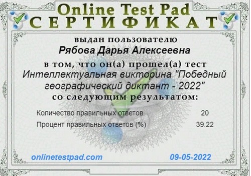 9 Мая в рамках мероприятий, посвященных празднованию 77-годовщины Победы в Великой Отечественной войне 1941-1945 годов, Рябова Дарья, обучающаяся 7 класса Шутиловской основной школы приняла участие в интеллектуальной викторине «Победный географический диктант-2022».
